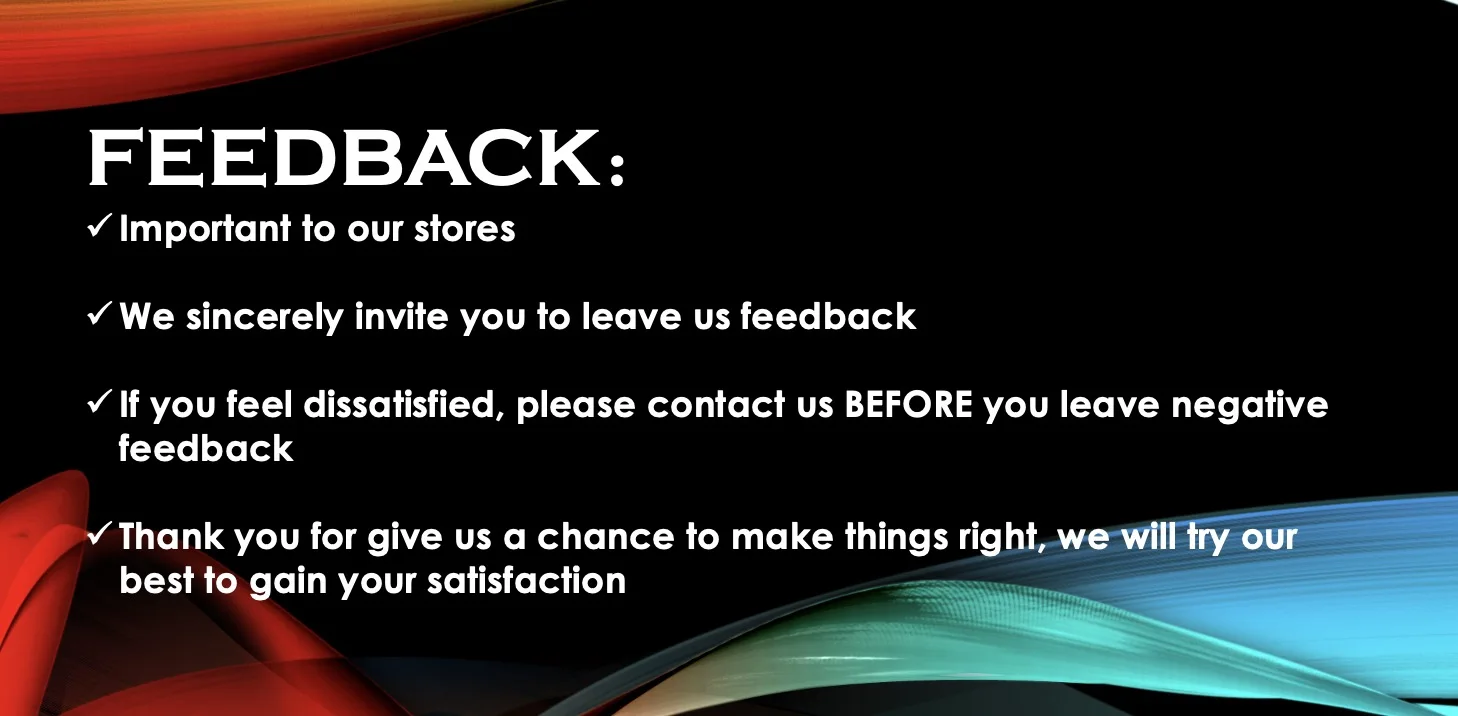 Feedback is important to us, and if you are happy with our products and services, please take the time to leave positive feedback.Thank you and please contact us before giving any non-positive feedback.Thank you for giving us an opportunity to solve the problem through good communication. At the same time, I really appreciate your understanding, trust and support for our company. Thank you
