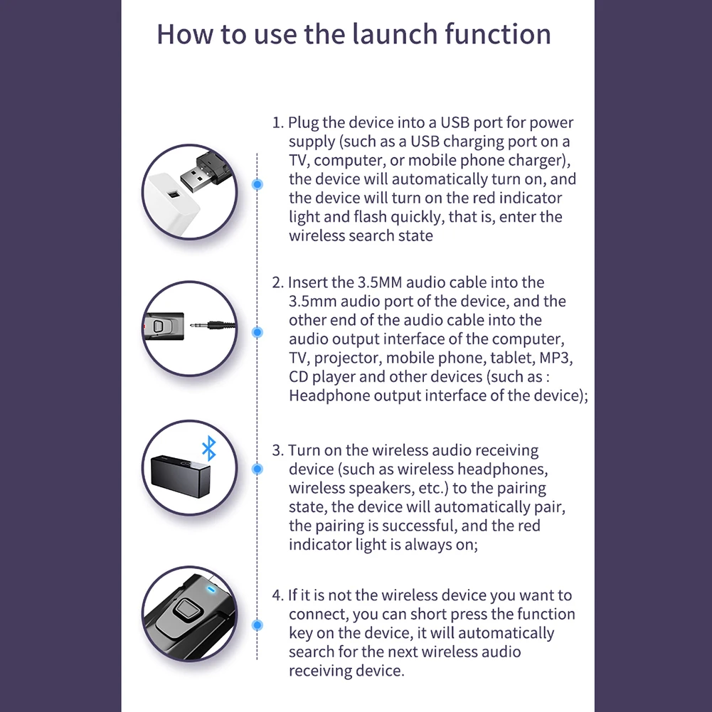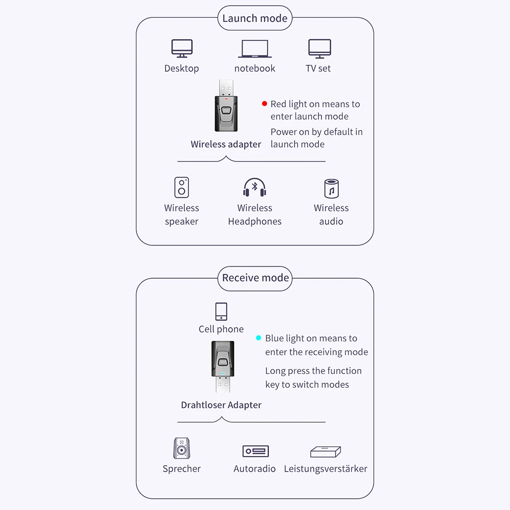 -Режим передатчика: Беспроводная передача аудио с вашего телевизора без Bluetooth, домашней стереосистемы или CD-плеера на наушники или колонки Bluetooth.