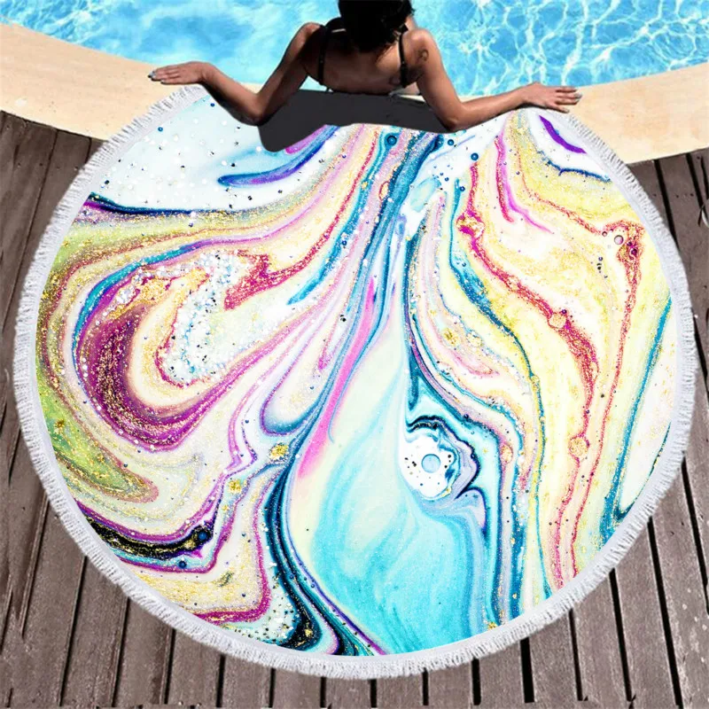Красочные блестящие круглые пляжные полотенца, золотисто-зеленые мраморные волнистые каменные полотенца с кисточками для плавания, коврик для йоги, Прямая поставка, домашний декор