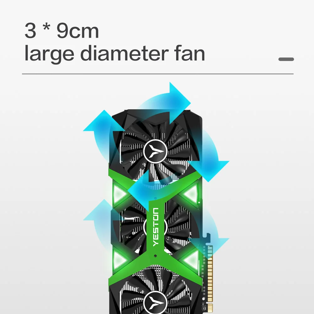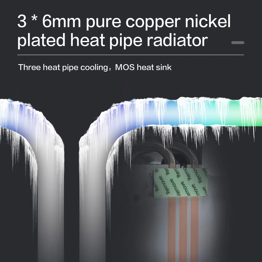 (1) Три вентилятора и три тепловые трубки; беззвучный отвод тепла стабильный, прочный и гарантированный;