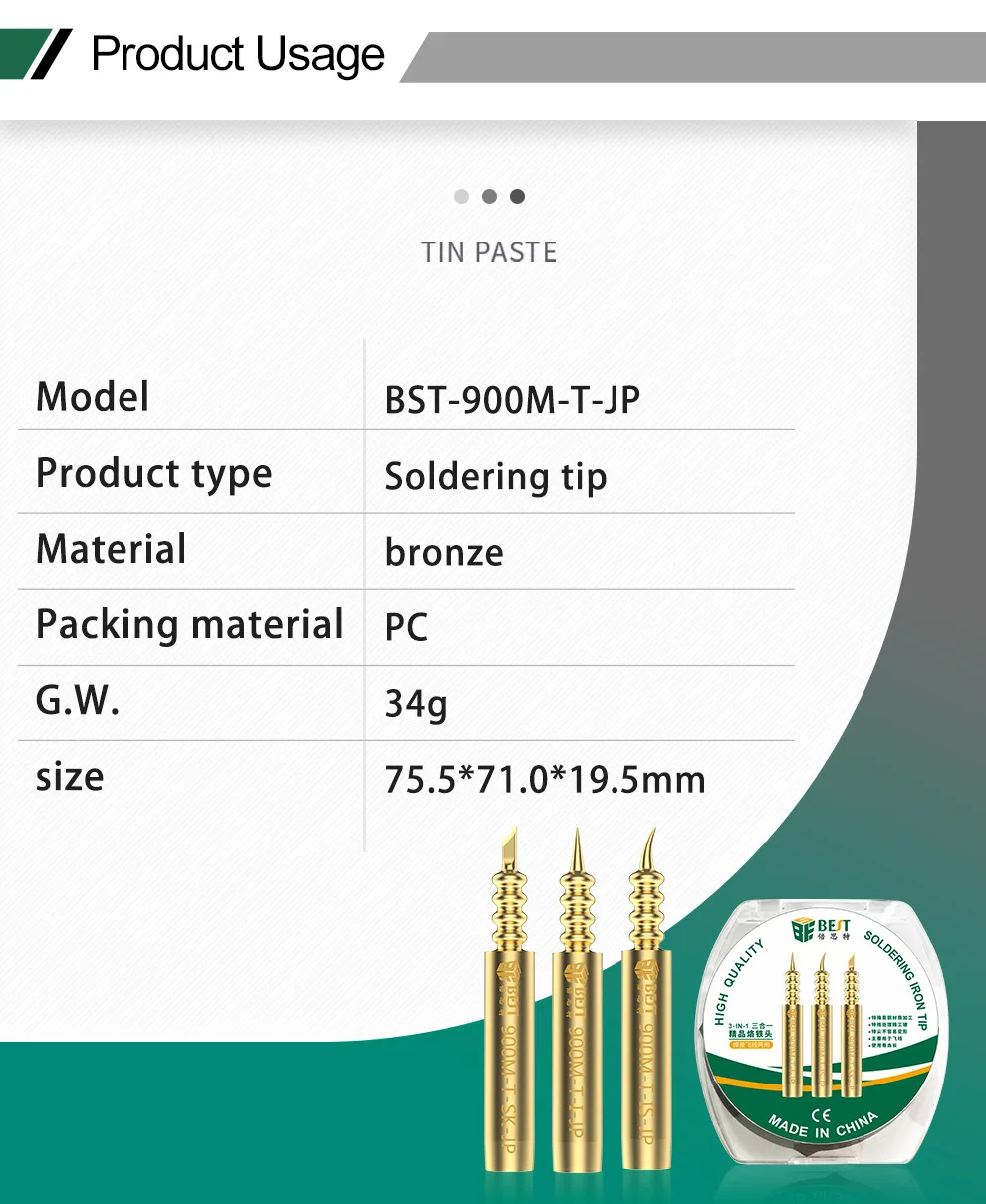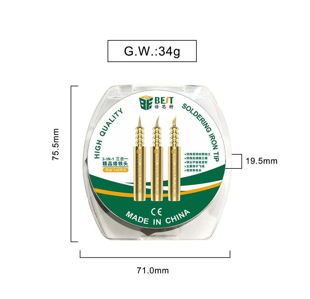 Особенности: Модель: BEST-900M-T-JP Тип изделия: наконечники паяльника Материал: бронза G.W.: около 34g Размер: 75,5*71,0*19,5 мм Может припаять различные печатные платы Высокая термостойкость