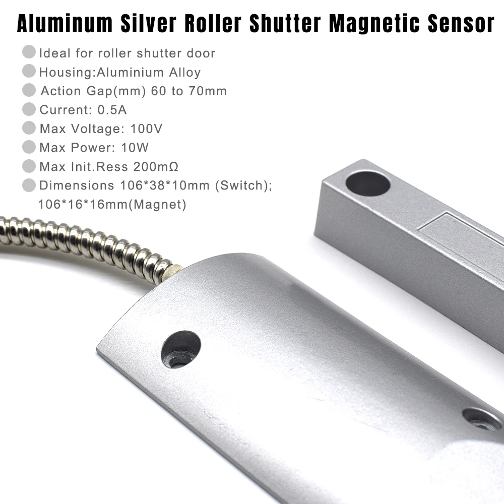 Отличный Алюминиевый Серебряный роликовый затвор магнитный датчик Цвет: серебристо-серый Соединительная поверхность винтового терминала Идеально подходит для двери рольставни Корпус: алюминиевый сплав Выход NC/Changeoever доступен Зазор действия (мм) от 60 до 70 мм Ток: 0.5A Максимальное напряжение: 100 в Максимальная мощность: 10 Вт Max Init.Ress 200mΩ Размеры 106*38*10 мм (переключатель);106*16*16 мм (магнит)