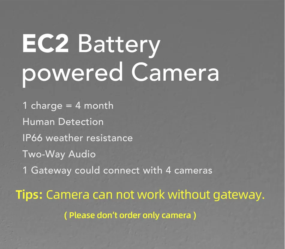 Камера EC2 должна быть подключена к шлюзу для нормального использования. В международной версии Стандартный Шлюз может подключаться к 4 камерам. Покупка камеры + шлюза может сэкономить вам много денег.