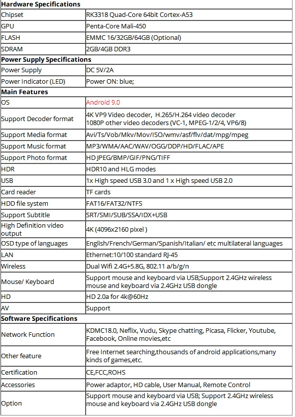 Есть три варианта для H96 MAX Box: A: 2 ГБ + 16 ГБ + 2,4 ГГц и 5,8 ГГц двойной Wifi + BT4.0 B: 4 Гб + 32 ГБ + 2,4 ГГц и 5,8 ГГц двойной Wifi + BT4.0 C: 4 Гб + 64 ГБ + 2,4 ГГц и 5,8 ГГц двойной Wifi + BT4.0