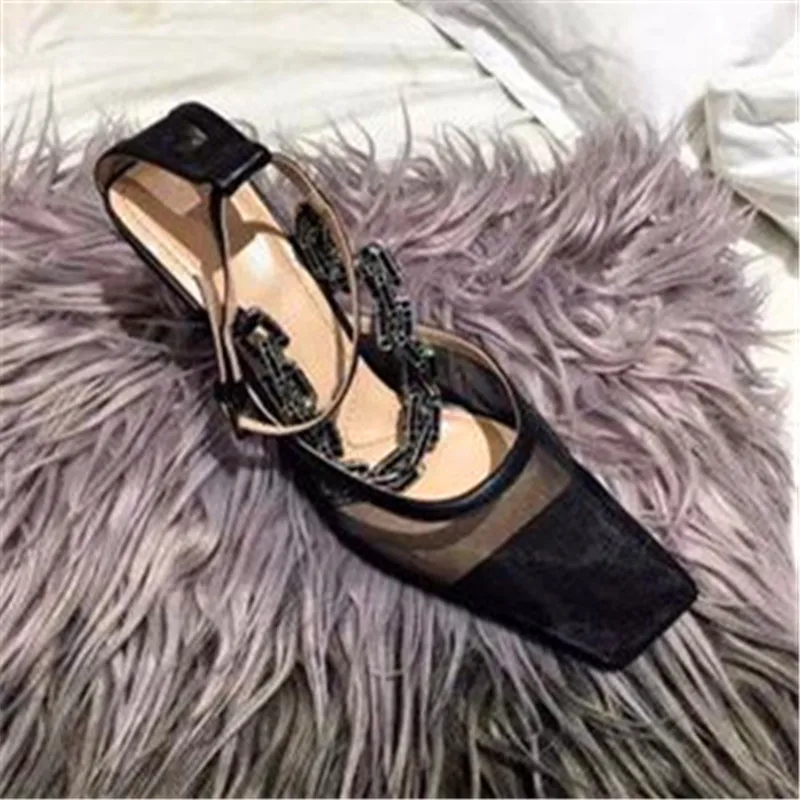Металлические стразы; Женские туфли на высоком каблуке с цепочкой; Цвет черный, белый, абрикосовый; С квадратным носком; С сеткой; Летние вечерние туфли на высоком каблуке-шпильке