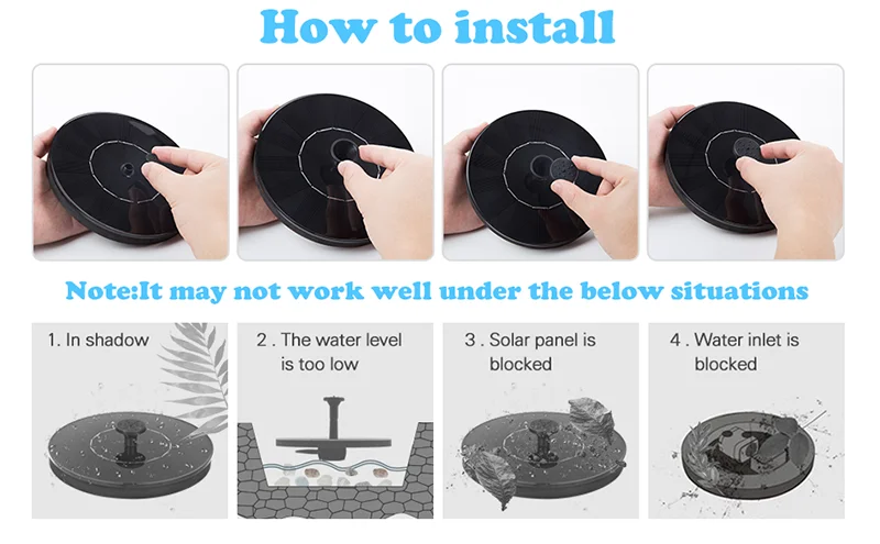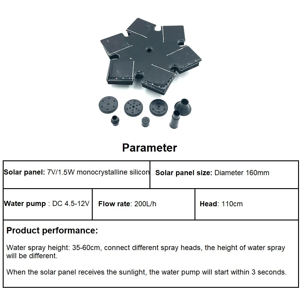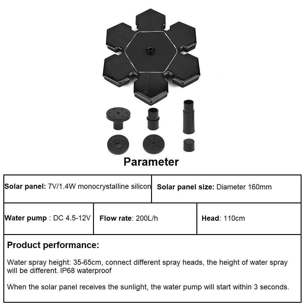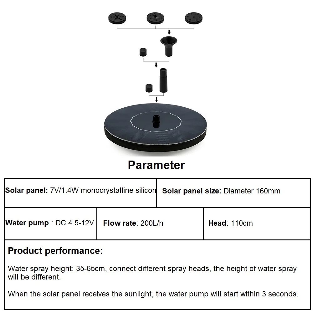 1,4 Вт питание от солнечной энергии: фонтану солнечной птичьей ванны требуется всего 3 секунды, чтобы работать автоматически при прямом солнце, с распылением высотой 50-70 см. Нет необходимости в электричестве или батарее. Защита безопасности: Теперь мы добавили новую функцию «функция защиты от нехватки воды», это позволит фонтану сделать несколько испытаний на измерение воды в течение 20 секунд, если тест обнаруживает нехватку воды, он автоматически переключается на функцию защиты через 20 секунд. Распылитель для различных видов воды: В комплект входит несколько насадок, что позволяет легко выбирать различные рисунки фонтанов воды, добавляя много удовольствия в ваш сад. Простота в использовании: просто положите в воду, насос начнет работать в 3s, когда он будет подвержен воздействию достаточного солнечного света, идеально подходит для ванны с птицами, аквариума, маленького пруда, бассейна, садовое украшение, циркуляция воды для кислорода. Если насос не может работать на солнце, пожалуйста, примите меры: Очистите и осмотрите насос, снимите всасывающее сопло и снимите внутренний воздух. Поместите его в солнечное место, переустановите сопло, нажмите панель полностью в воду, а затем отпустите. Советы: Часто чистите солнечную панель, держите воду в чистоте и регулярно чистите насос (рекомендуется один раз в месяц).