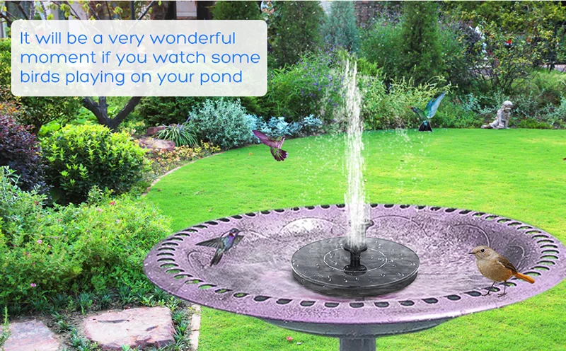 Подходит для нескольких мест Этот Солнечный водяной фонтан является идеальным акцентом для вашего сада или двора, особенно небольшие приложения, такие как ванна для птиц или маленький пруд. Компактный размер отлично подходит для активного отдыха. Солнечный фонтанный насос плавает на воде и не требует электричества. Будет работать автоматически, когда солнечный свет попадет на солнечную панель.