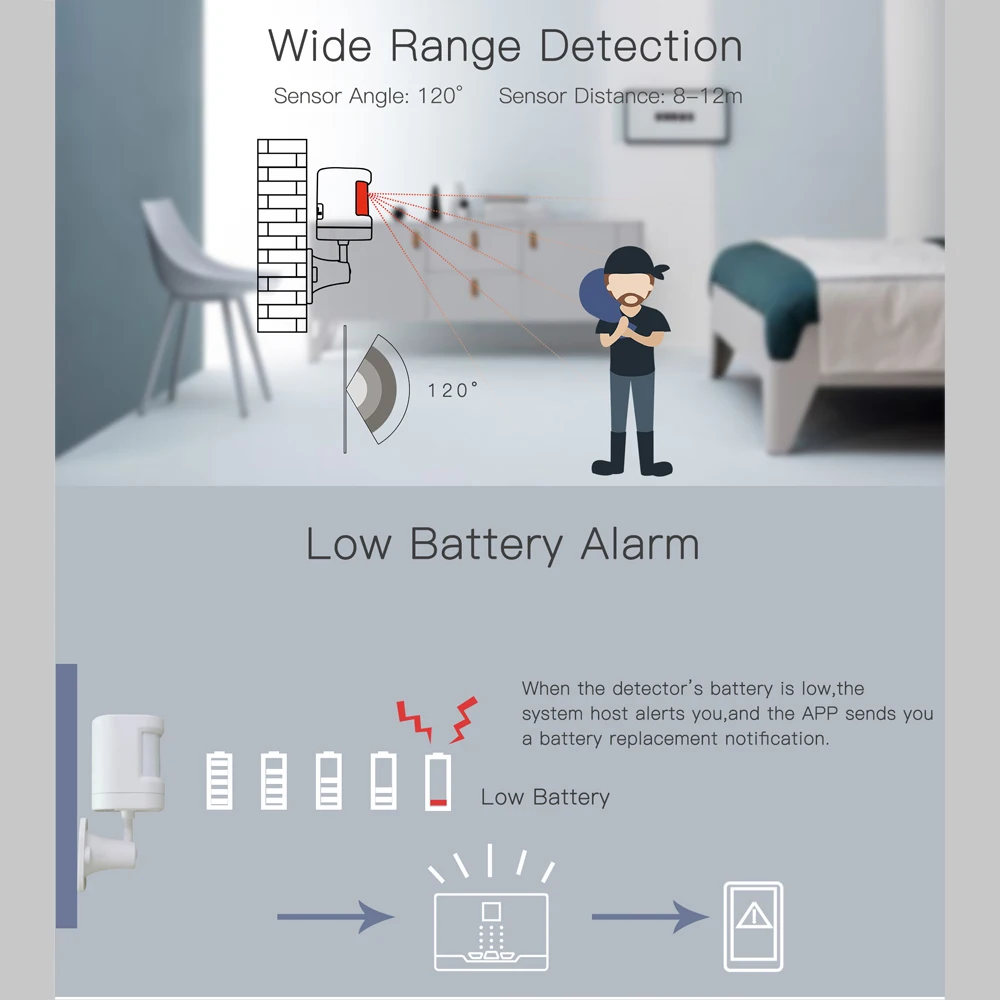 * Уведомление приложения от подключенного датчика обнаружения онлайн охраняет ваш дом в любое время в любом месте.