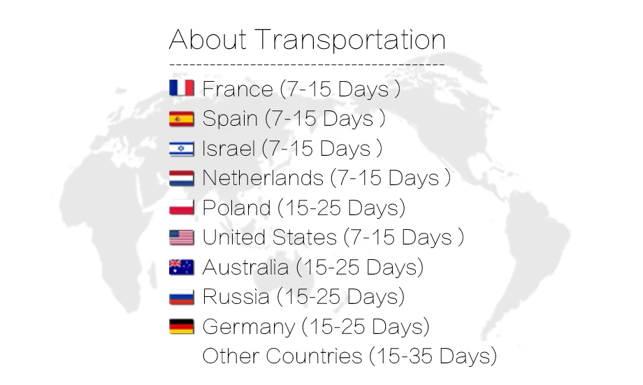 1. Обычно заказ будет отправлен в течение 1 рабочих дней после получения полной оплаты. 2. В связи с таможней, погодой и т. д. посылка может задержаться, иногда это может занять немного больше времени, чтобы получить посылка, пожалуйста, свяжитесь с нами, чтобы продлить срок защиты вашего заказа