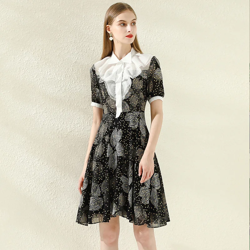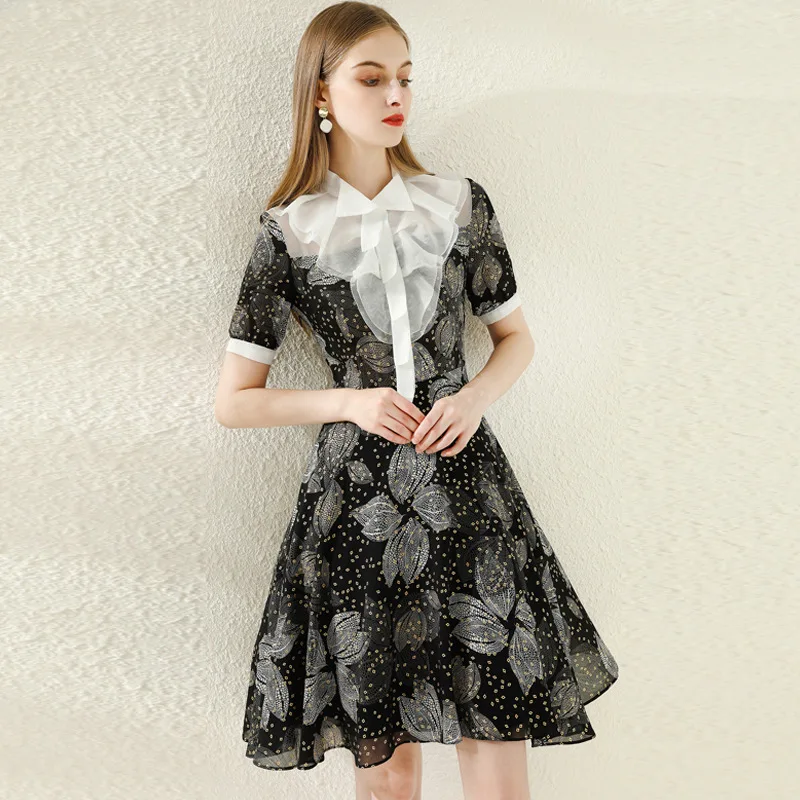 Подиумное винтажное женское летнее элегантное модное Черное мини-платье трапециевидной формы с цветком-бабочкой 2020 Новая летняя дизайнерская шифоновая одежда