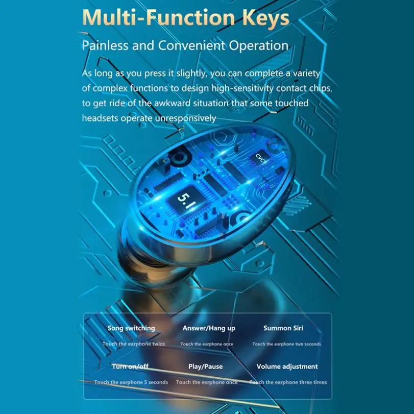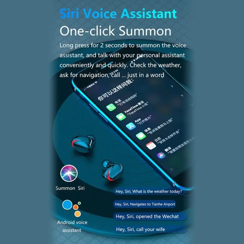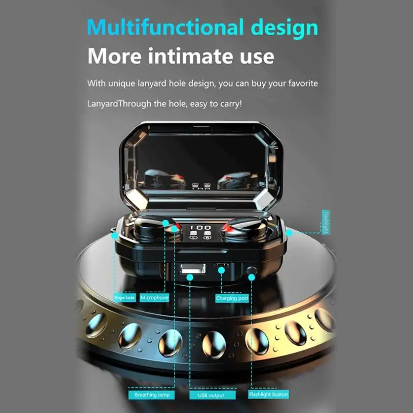 Спецификация продукта: 1. Модель: M15 2. Спецификация Bluetooth: V5.0 3. Профиль Bluetooth: A2DP,AVRCP, HFP;HSP 4. Рабочее напряжение: 3,1 В ~ 4,2 В; 5. Напряжение зарядки: 5V-1A; 6. Емкость аккумулятора гарнитуры: 60 мАч; 7. Емкость аккумулятора: 2200 мАч; 8. Расстояние передачи:>10 м 9. Время вызова: 4 ч; 10. Время воспроизведения: 4 ч; 11.Waterprof :IPX7 12. Время зарядки гарнитуры: 1 ч; 13. Время зарядки зарядного устройства: 2 ч; 14. Система поддержки: все bluetooth-устройства и мобильные телефоны; Продукты включают в себя 1 * одна пара bluetooth-гарнитур 1 * зарядное устройство 1 * зарядный кабель 1 * Руководство пользователя 4 * Ушная крышка