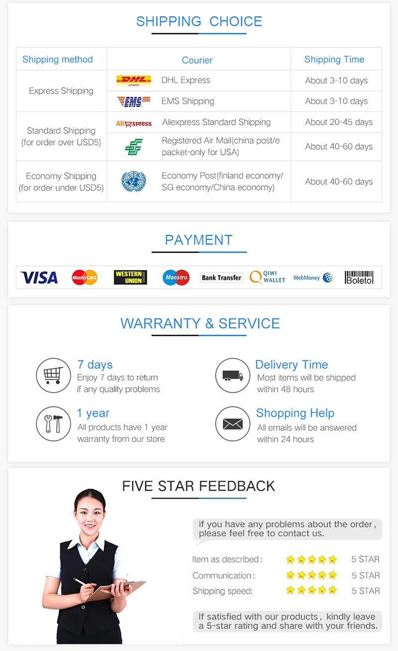 В: когда мы отправим Ваш заказ? О: после того как мы получим ваш заказ, мы отправим Ваш заказ в течение 48 часов. (за исключением праздников) Вопрос: Сколько времени займет для меня, чтобы получить посылка О: мы используем Aliexpress стандартную доставку или ePacket. Обещанное время доставки составляет 15-30 дней, если вы не получили посылка в течение 60 дней, мы вернем вам деньги или отправим Ваш заказ снова. Ваши деньги в безопасности. Специальные страны, такие как Бразилия, Чили, мы стремимся к сроку доставки 15-60 дней. Вопрос: Что делать, если я получил ошибку или повреждение продукта? О: если вы получили ошибку или повреждение продукта, пожалуйста, немедленно свяжитесь с нами, мы быстро ответим и предложим вам решение, вы получите возврат или замену. Вопрос: о гарантийном обслуживании. О: продукт имеет 1 год гарантийного обслуживания. Если продукт не может работать в течение 15 дней после его получения (естественный ущерб), вы можете заменить новый бесплатно. Вопрос: о отзывы О: если вы удовлетворены нашим продуктом, пожалуйста, дайте нам все 5 звезд. Если у вас есть какие-либо вопросы, пожалуйста, не оставляйте нам негативные отзывы. Пожалуйста, немедленно сообщите нам, мы предоставим вам лучший сервис и решение.