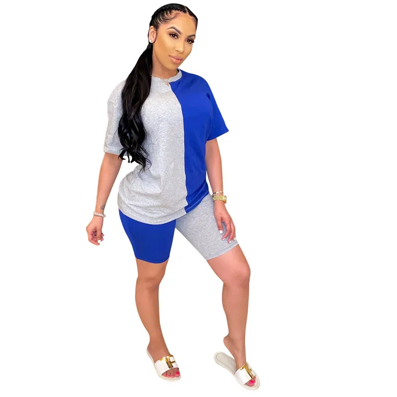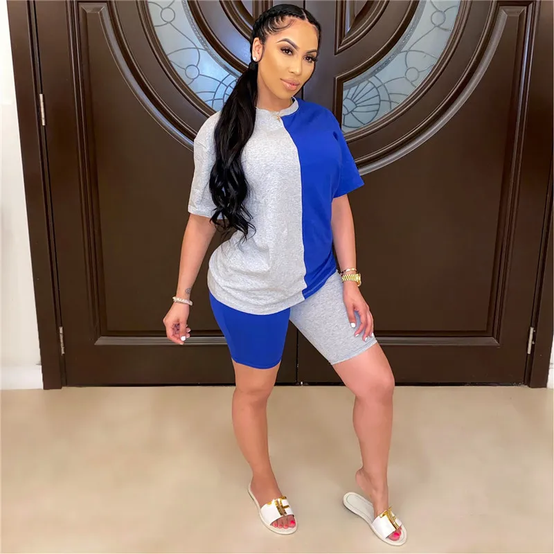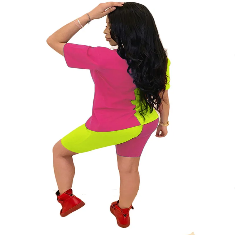 Женский модный комплект одежды из 2 предметов, пуловер с коротким рукавом, футболка с цветными блоками и шорты, комплект спортивной одежды для тренировок, цветной комплект в стиле пэчворк