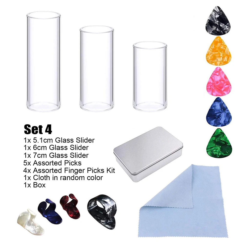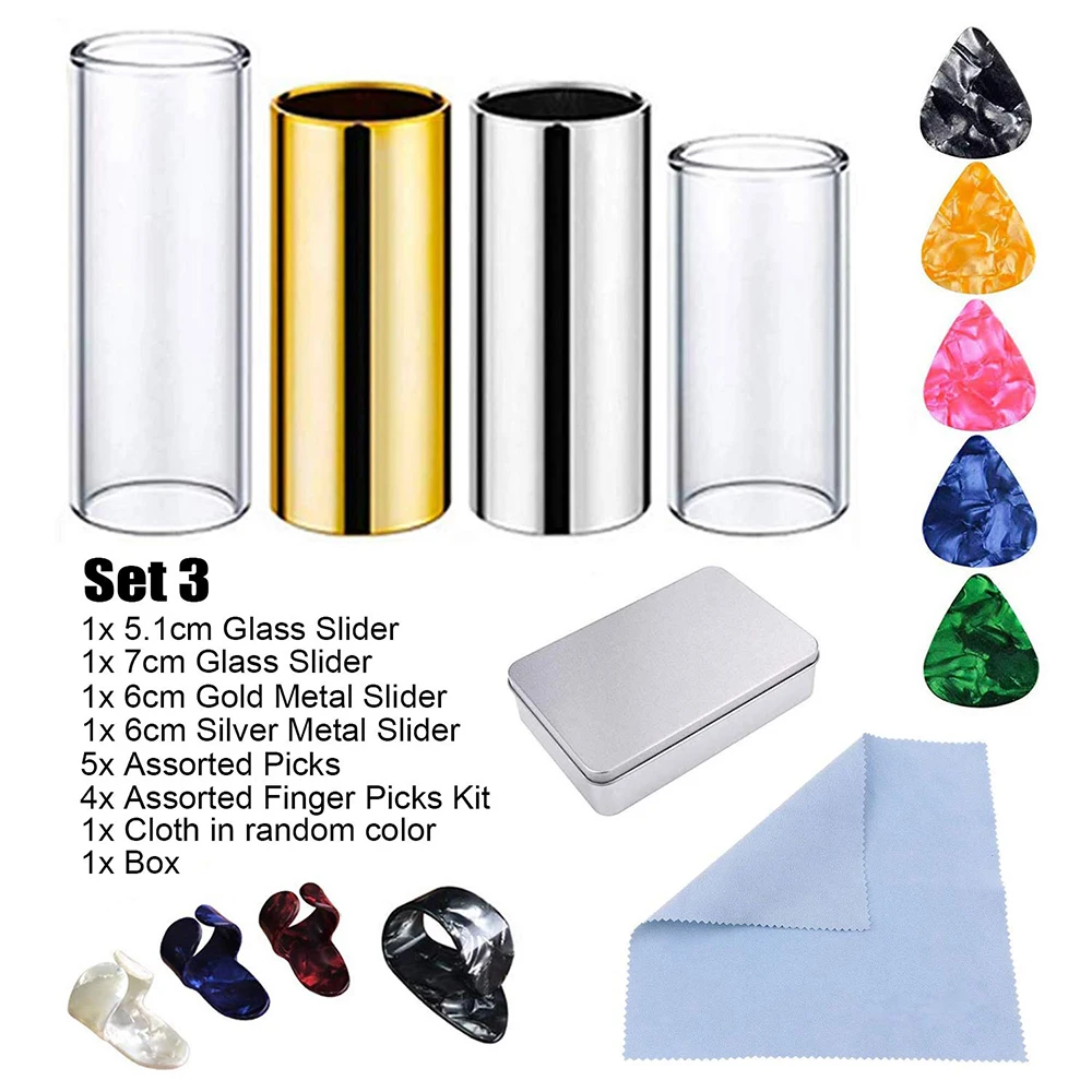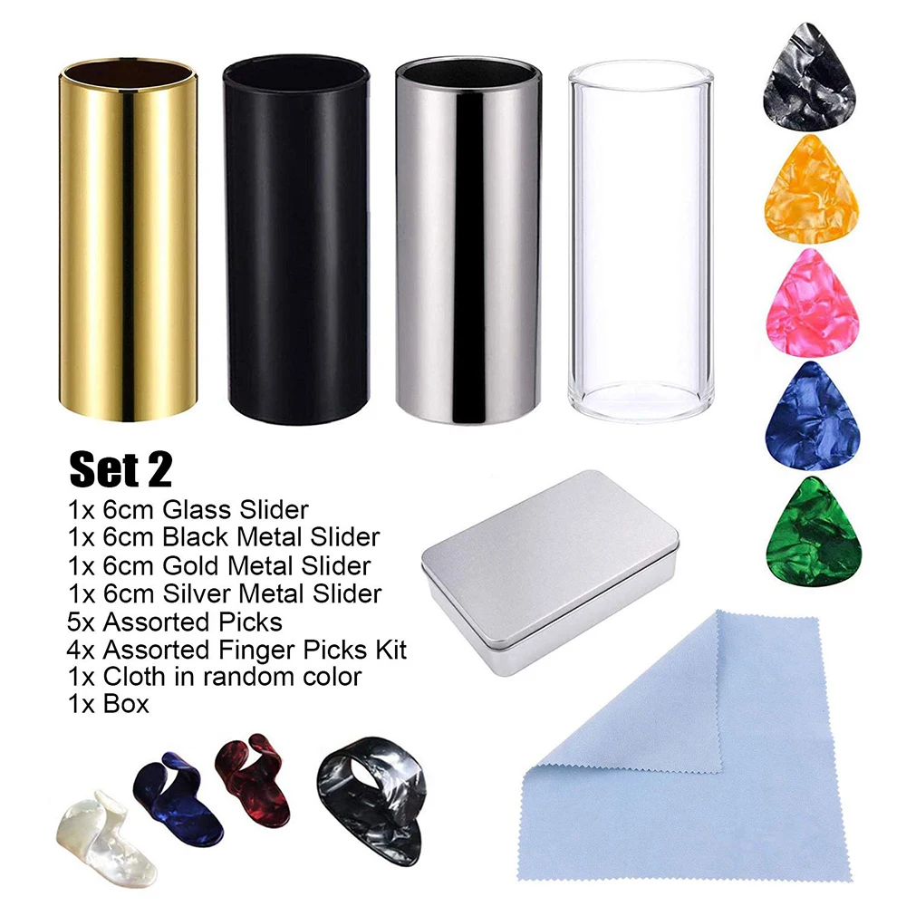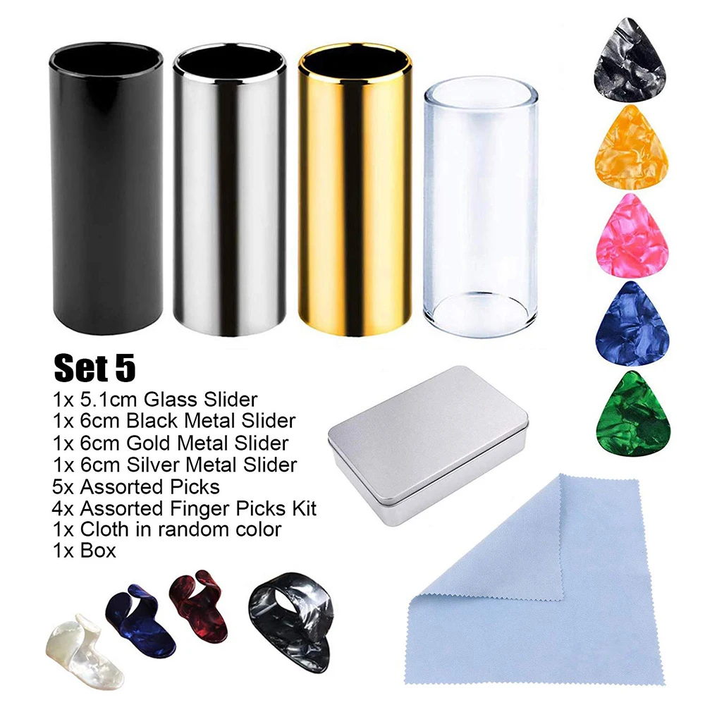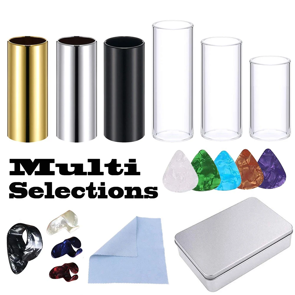The guitar accessories set includes glass metal slider, assorted picks, finger cover, cleaning cloth, etc. It is used for electric guitar to make smoother sound.