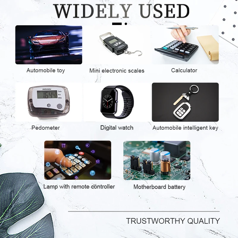 Используется для электрическая игрушка, калькулятор, лазерная указка, материнская плата компьютера, электронный словарь, часы, электронные весы, кардиостимулятор, электронный слуховой аппарат, счетчик, часы, часы, игры, цифровая камера, видеокамера, PDA, mp3-плеер, пульт дистанционного управления, электронный инструмент, диктофон, глюкометр, Измеритель холестерина светодиодный светильник и другие электронные приборы.