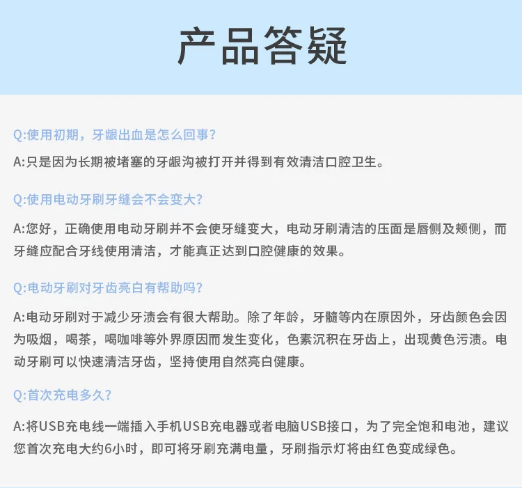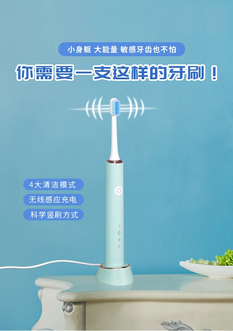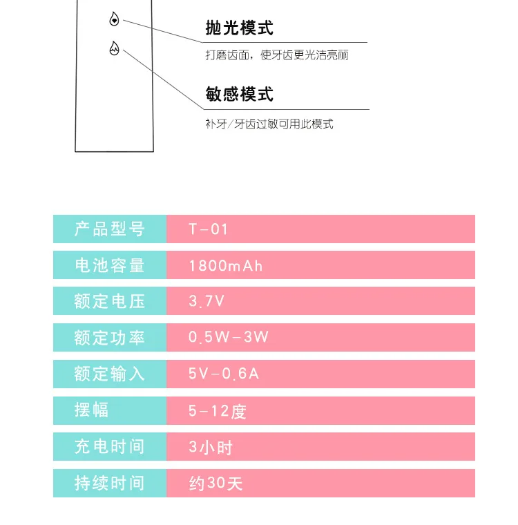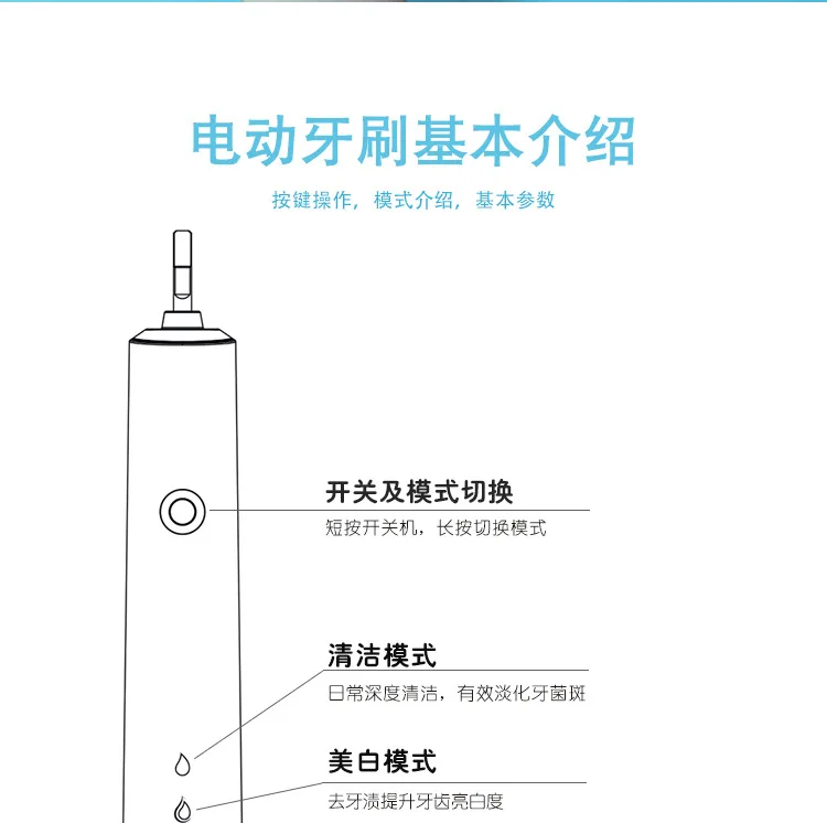 Как использовать электрическую зубную щетку? 1. Установите головку зубной щетки на электрическую зубную щетку (необходимо выровнять интерфейс и затянуть) 2. Возьмите небольшое количество зубной пасты на головке кисти и намочите ее 3. После мочи положите его в рот и начните зубную щетку, затем медленно и равномерно двигайтесь 4. При чистке зубов щетинки и десны находятся под углом 45 градусов 5,30 секунд, чтобы напомнить заменить область зуба, научная Чистка в течение 2 минут 6. После чистки зубов, вы можете непосредственно краску щеточной головки и тела чистой водой