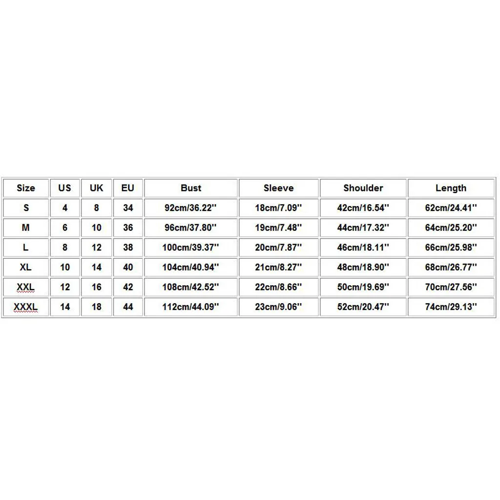 | Размеры: XXXL | Свяжитесь с нами: 14 | Великобритания: 18 | ЕС: 44 | Обхват груди: 112 см/44,09 дюйма | Рукав: 23 см/9,06 дюйма | Ширина плеч: 52 см/20,47 дюйма | Длина: 74 см/29,13 дюйма |