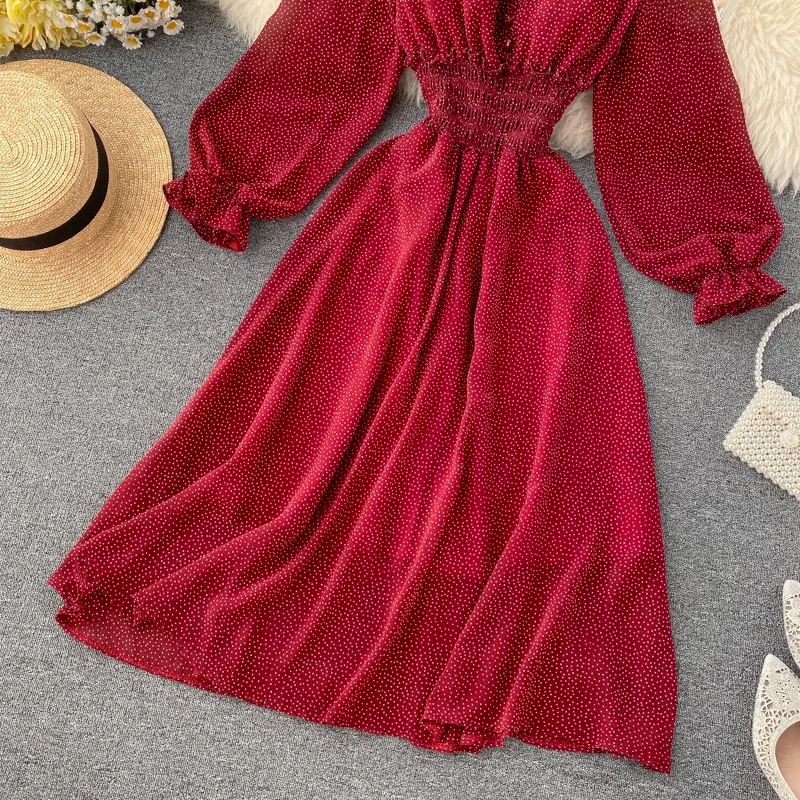 Наименование товара:Летнее женское платье в горошек, сексуальное платье с v-образным вырезом и пышными рукавами, платье с длинными рукавами, юбка, талия, тонкие шифоновые платья LL043