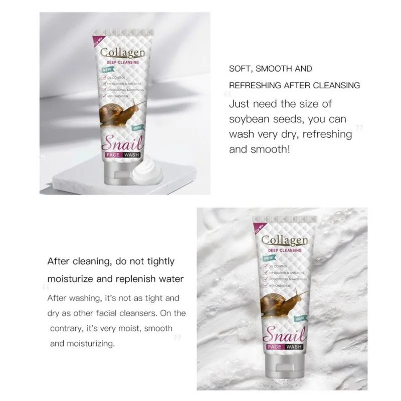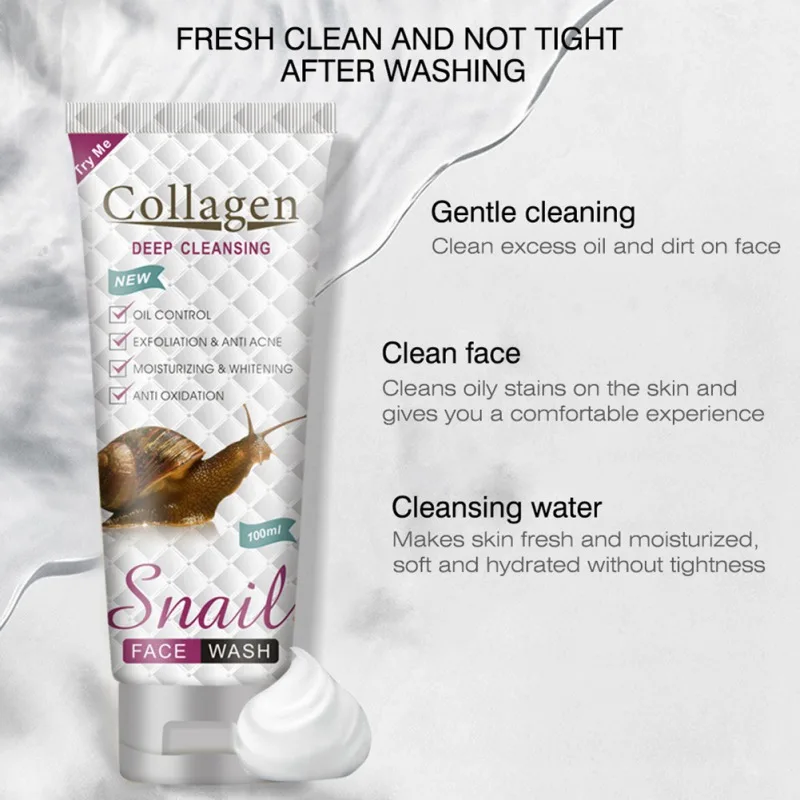 Название: очищающее средство для лица с улиткой Спецификация: 100 мл Место происхождения: Гуандун, Китай применимые люди: пена деликатная и богатая, и может аккуратно смывать излишки масла. Подходящие люди: подходящий пол для каждого: нейтральный