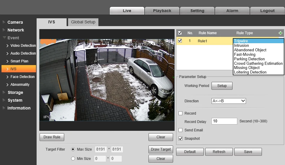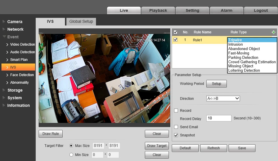Интеллектуальное обнаружение: Tripwire / Вторжение / Оставленный объект / Смена сцены / Пропавший объект / Быстрое движение / Обнаружение парковки / Оценка сбора толпы / Обнаружение бездействия / Обнаружение лиц