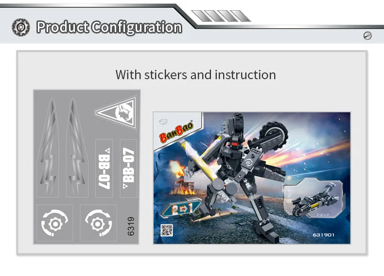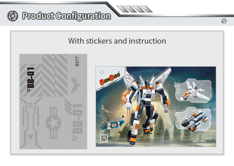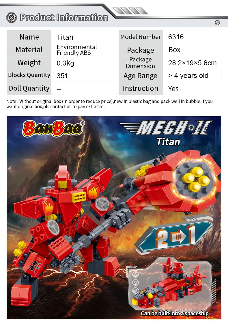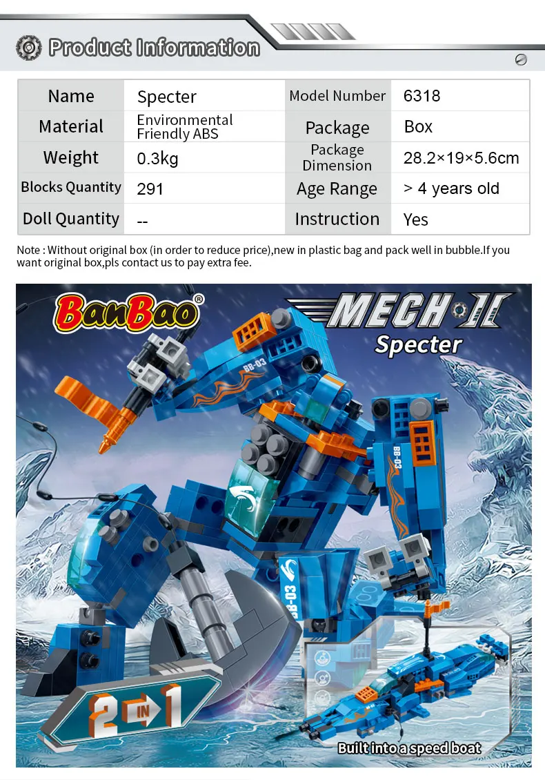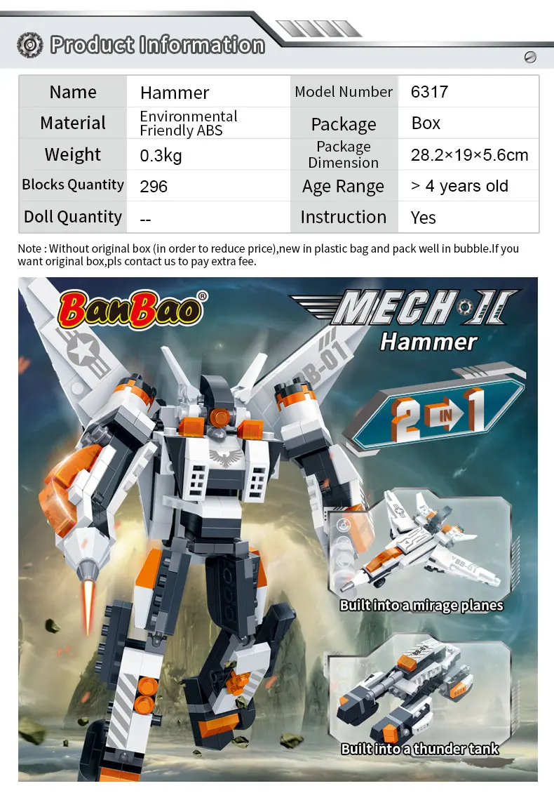 Фирменное наименование: BanBao Партномер: 6316 6317 6318 6319 6320 6321 6322 6323 Возраст: более 5 лет Материал: экологически чистый АБС-пластик Инструкция: Да Этот товар 2 в 1, не может быть собран до 2 моделей одновременно. Примечание: без оригинальной коробки (для снижения цены), Новый в полиэтиленовом пакете и хорошо упакован в пузырчатую коробку. Если вы хотите оригинальную коробку, пожалуйста, свяжитесь с нами, чтобы оплатить дополнительную плату.