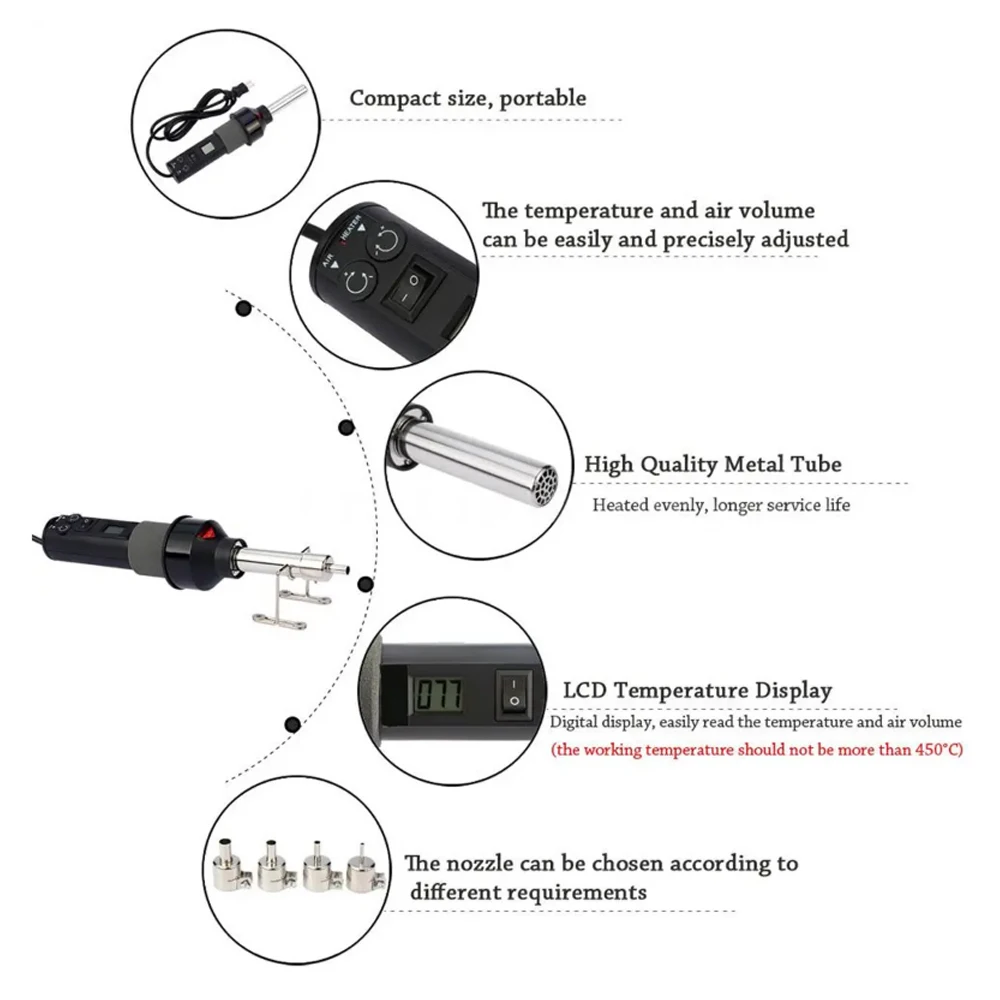 Перед тем как поднять «нагреватель» (температура), лучше поднять «воздух» (объем воздуха). Если вы используете напряжение 110 В, пожалуйста, не расстраивайте, вы можете найти этот пистолет горячего воздуха с вилкой 110 В US в SKU236994.