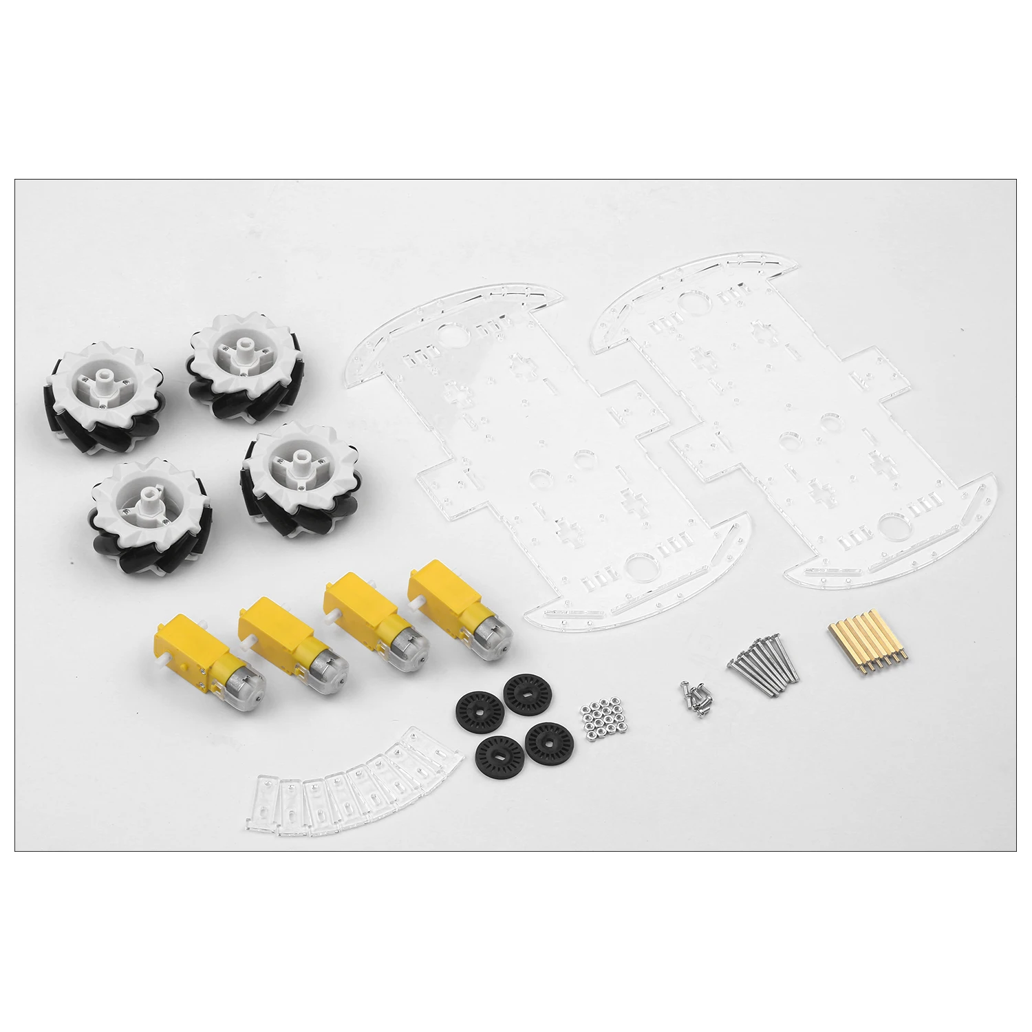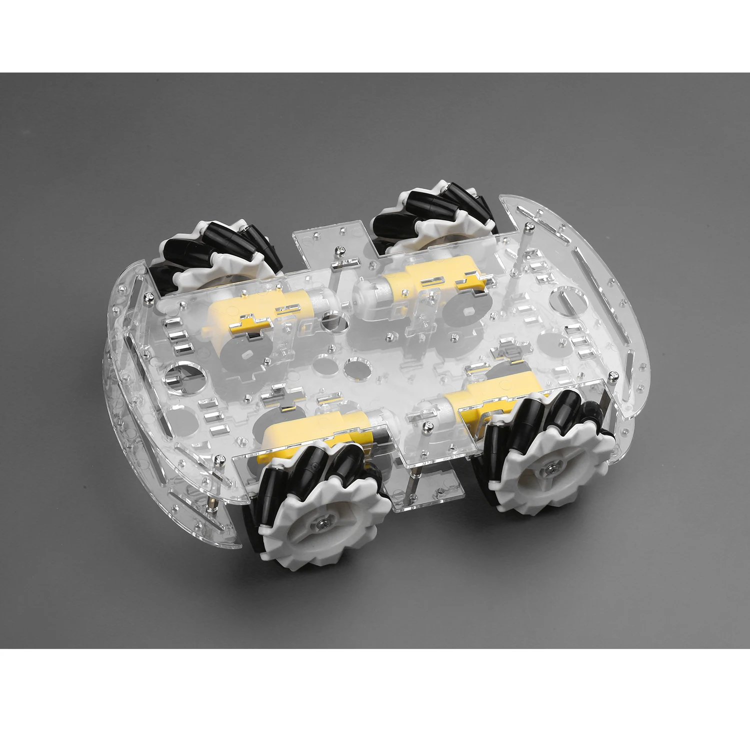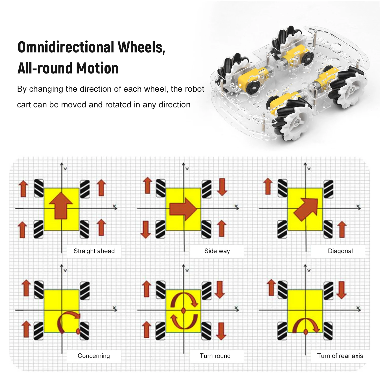 4 колеса Mecanum: 4 колеса Mecanum 65 мм могут быть перемещены в любом направлении без изменения направления вращения колес. Они изготовлены из прочного инженерного пластика и не легко повреждены.