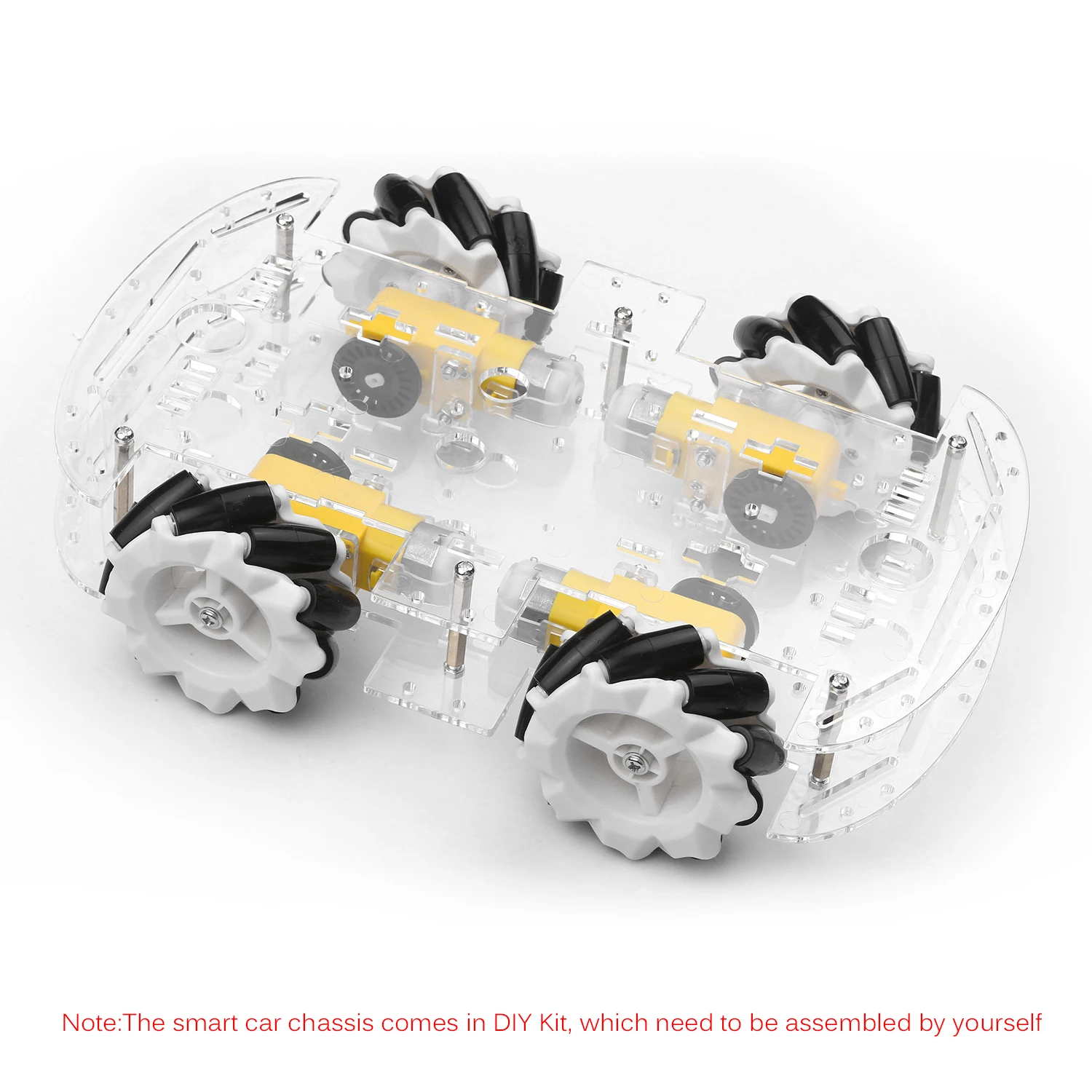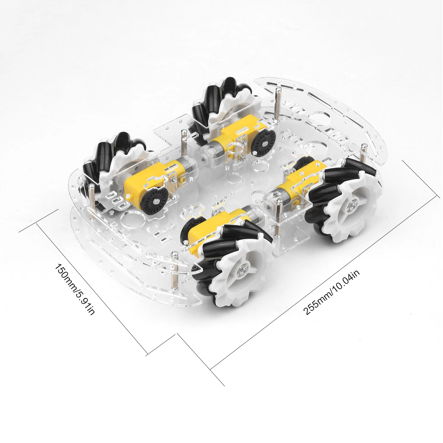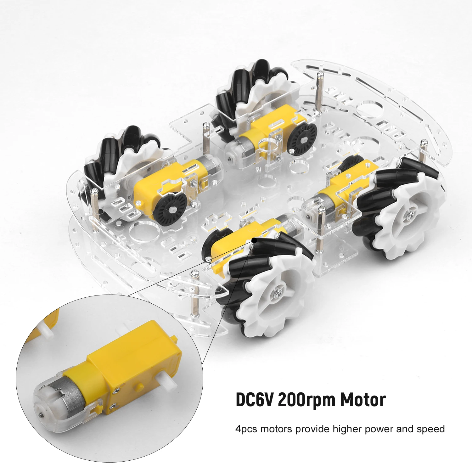 4 колеса Mecanum: 4 колеса Mecanum 65 мм могут быть перемещены в любом направлении без изменения направления вращения колес. Они изготовлены из прочного инженерного пластика и не легко повреждены.