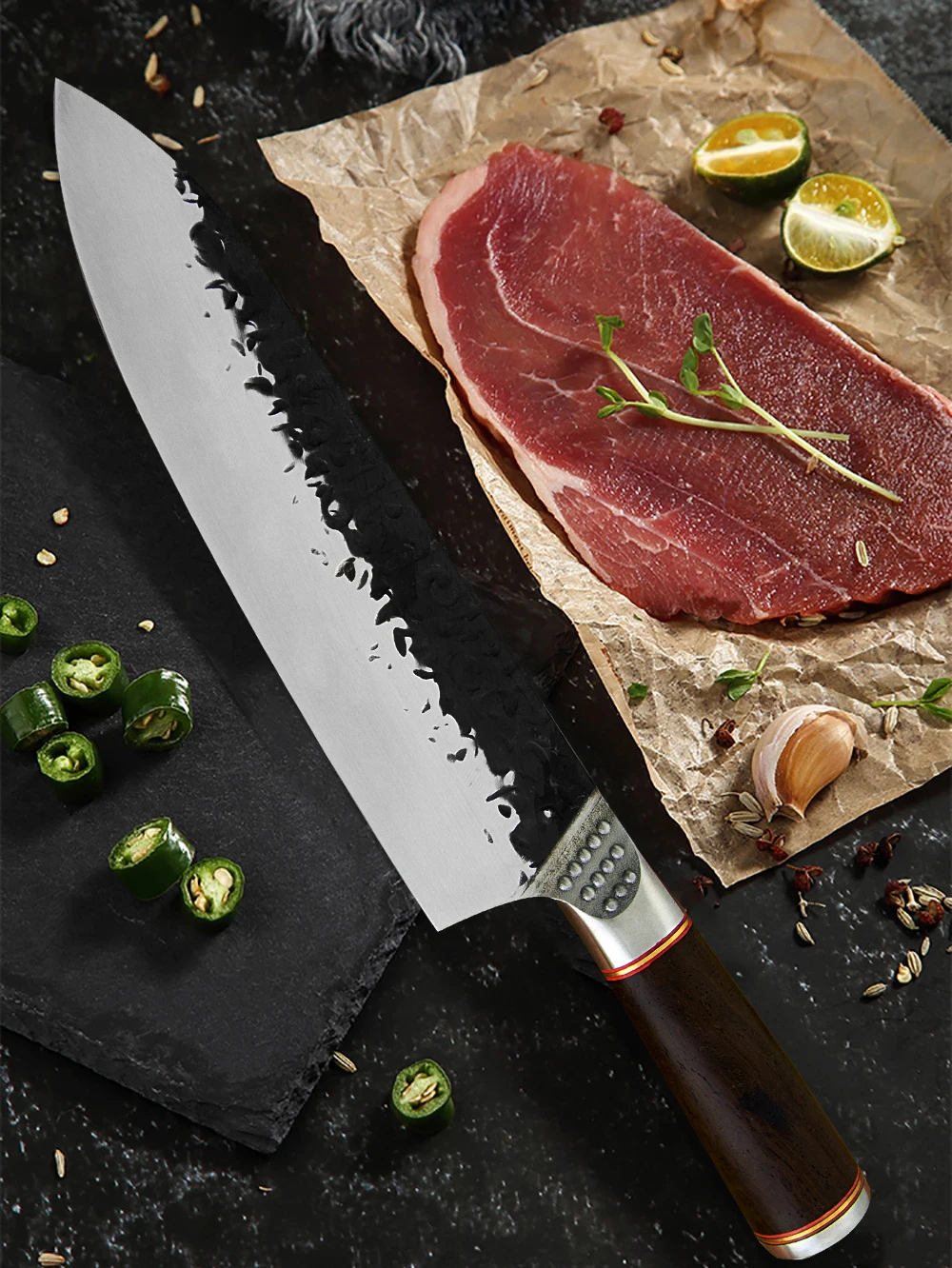 Полная длина: 277 мм Длина лезвия: 205 мм Ширина лезвия: 50 мм Толщина лезвия: 2,5 мм Материал: нержавеющая сталь 3cr1 3mov Материал ручки: деревянная ручка + стальная головка Твердость HRC: 54 +-2HRC Вес нетто: 277 г