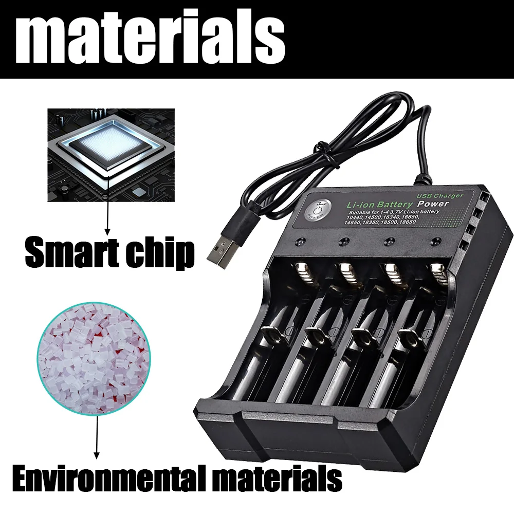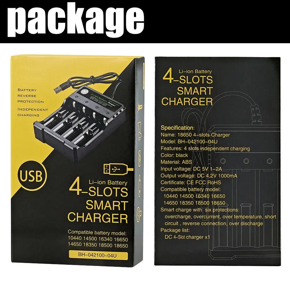 Характеристики:Название: литий-ионное зарядное устройство с 4 слотамиВходное напряжение: 5 В постоянного тока 1-2A USB портВыход напряжение: DC 4,2 V 1000mAРазмер: 15 см * 9 см * 3 смВес: 106 гСертификация: ЕС CE/EMC сертификация, США FCCСовместимая модель аккумулятора: 10440 14500 16340 1665014650 18350 18500 18650Особенности:Умный чип, быстрая зарядка;Защита от перезарядки;Защита от перегрузки;Защита от перегрузки по току;Обратная защита;Защита от короткого замыкания.![]()