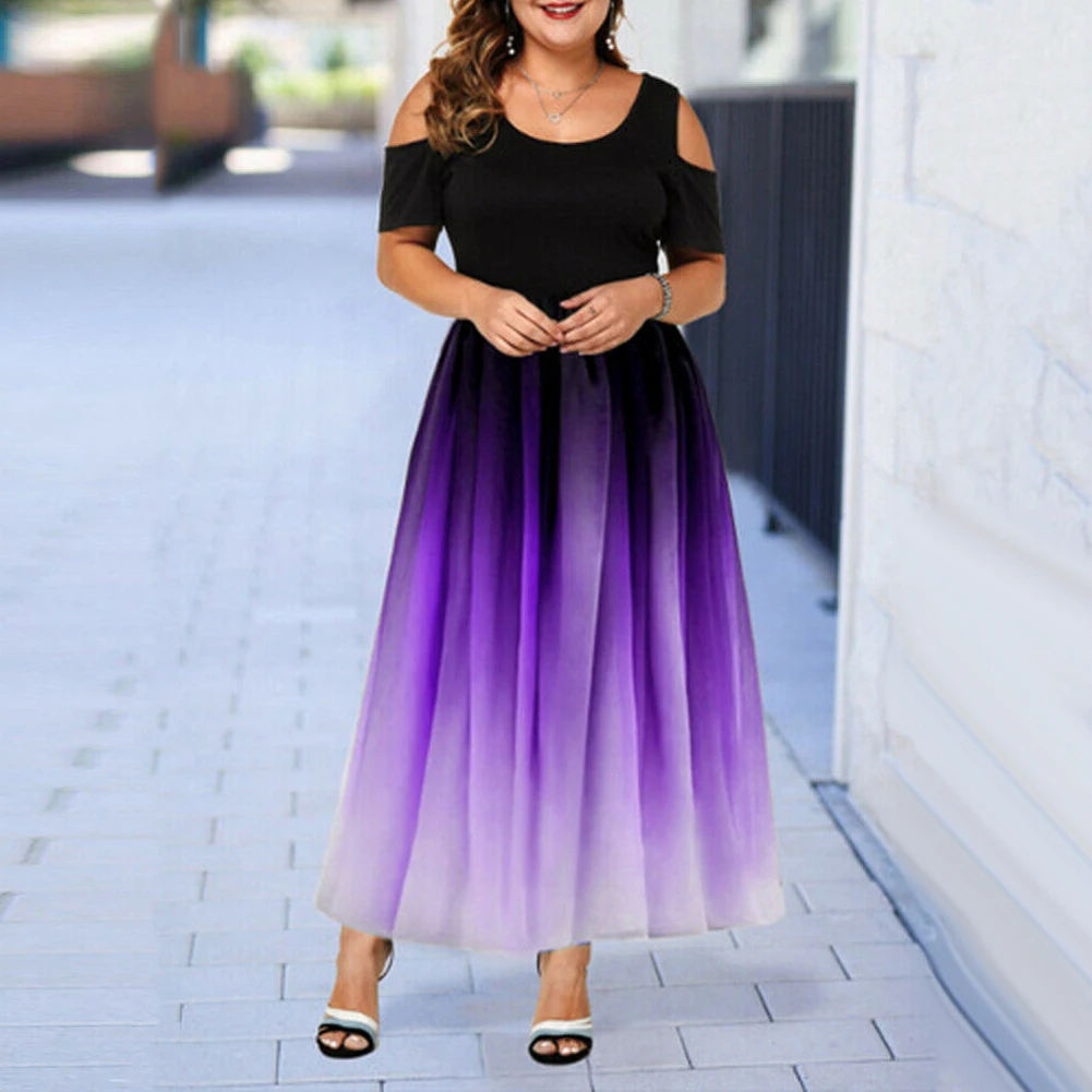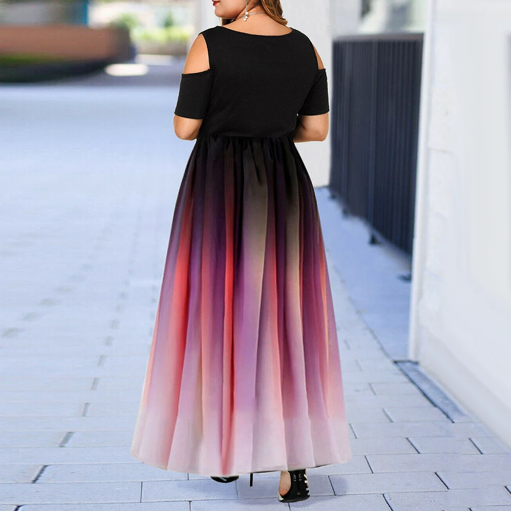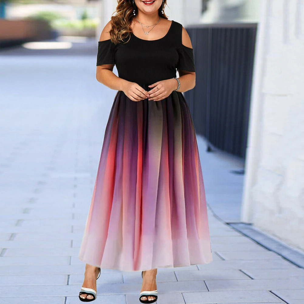 Особенности: холодное плечо, градиентный цветной принт, размера плюс