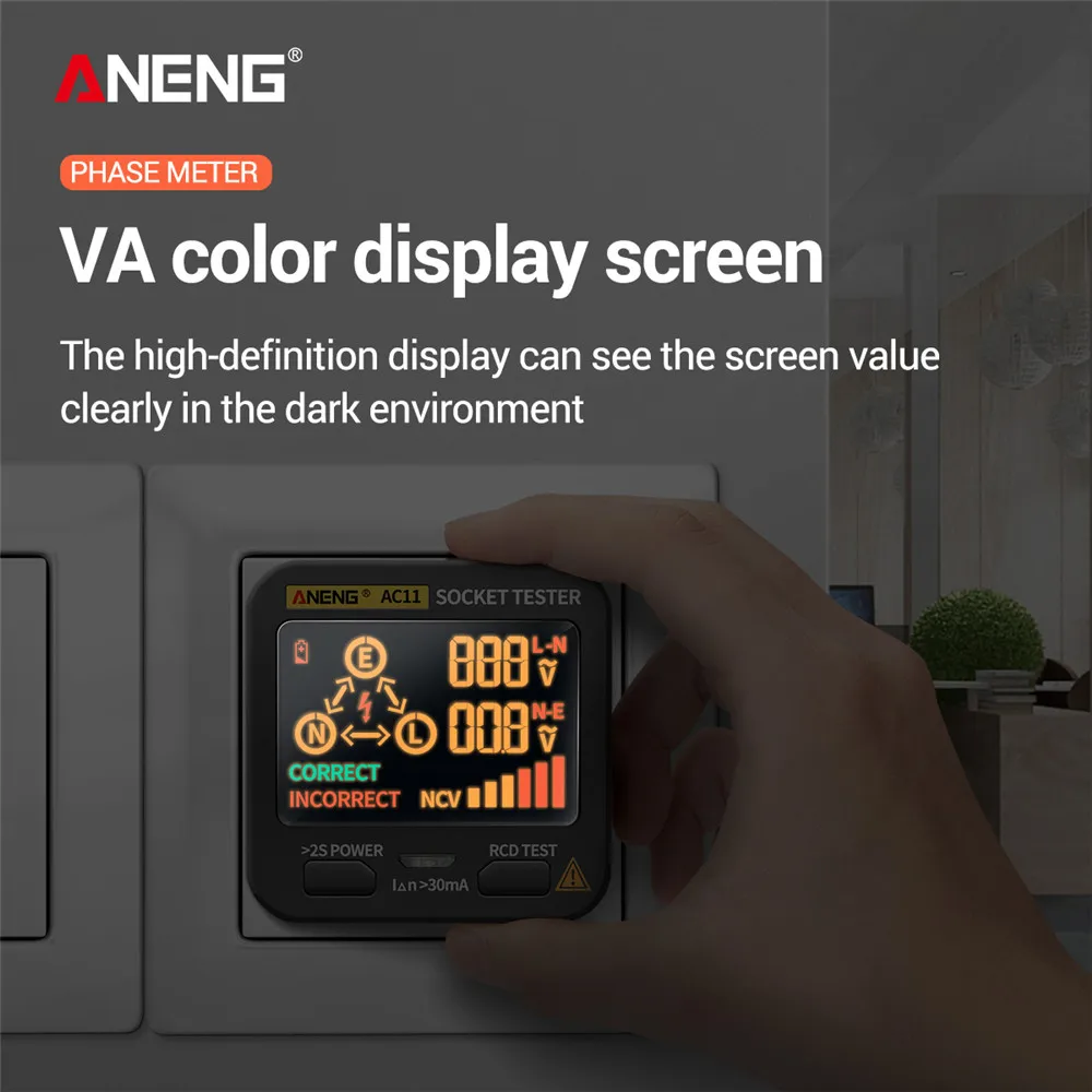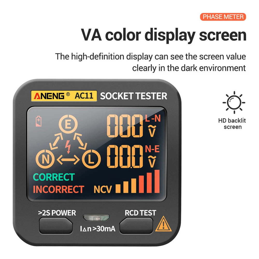 Этот умный тестер гнезда ANENG AC11 в основном используется для обнаружения полярности источника питания и безопасности выключателя утечки. Он может быстро и точно обнаруживать провод заземления нейтральный провод живой, утечка, отключение, напряжение гнезда и проводка гнезда, а затем одновременно отображать результаты на ЖК-экране светодиодный.