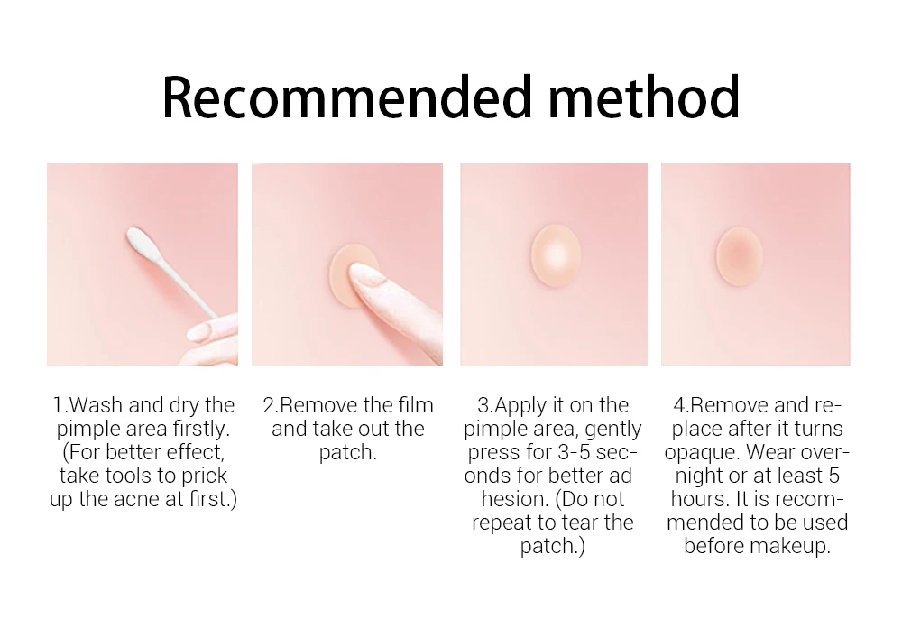 1. Сначала промойте и высушите область прыщей. (Для лучшего эффекта сначала используйте инструменты для удаления прыщей.) 2. Снимите пленку и выньте пластырь. 3. Нанесите его на область прыщей, аккуратно нажмите в течение 3-5 секунд для лучшей адгезии. (Не повторяйте, чтобы оторвать пластырь.) 4. Снимите и замените после того, как он станет непрозрачным. Носите на ночь или не менее 5 часов. Рекомендуется использовать перед макияжем.