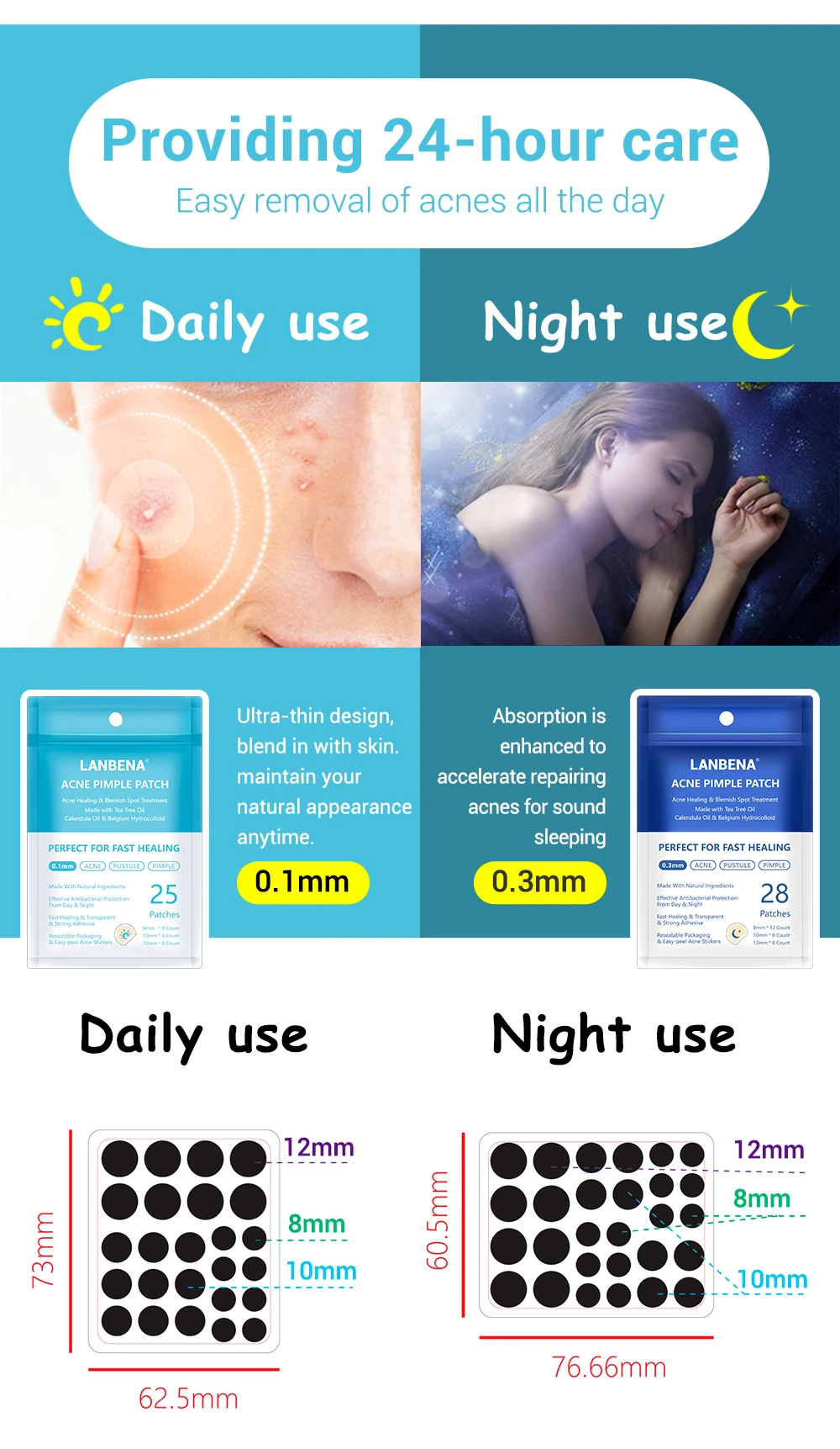 Легкое удаление acnes весь день Ежедневное использование Ночное использование Ультратонкий дизайн, сочетающийся с кожей. Сохраняйте свой естественный внешний вид в любое время. Поглощение усиливается, чтобы ускорить ремонт acnes для звукового сна 0,1 мм 0,3 мм