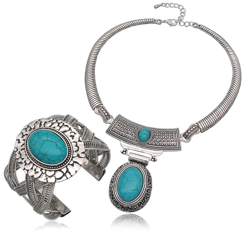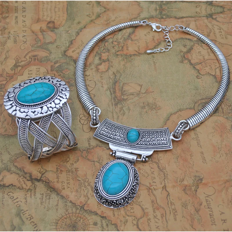 Браслет-манжета изготовлен из металла с античным серебряным покрытием и синтетической бирюзой
