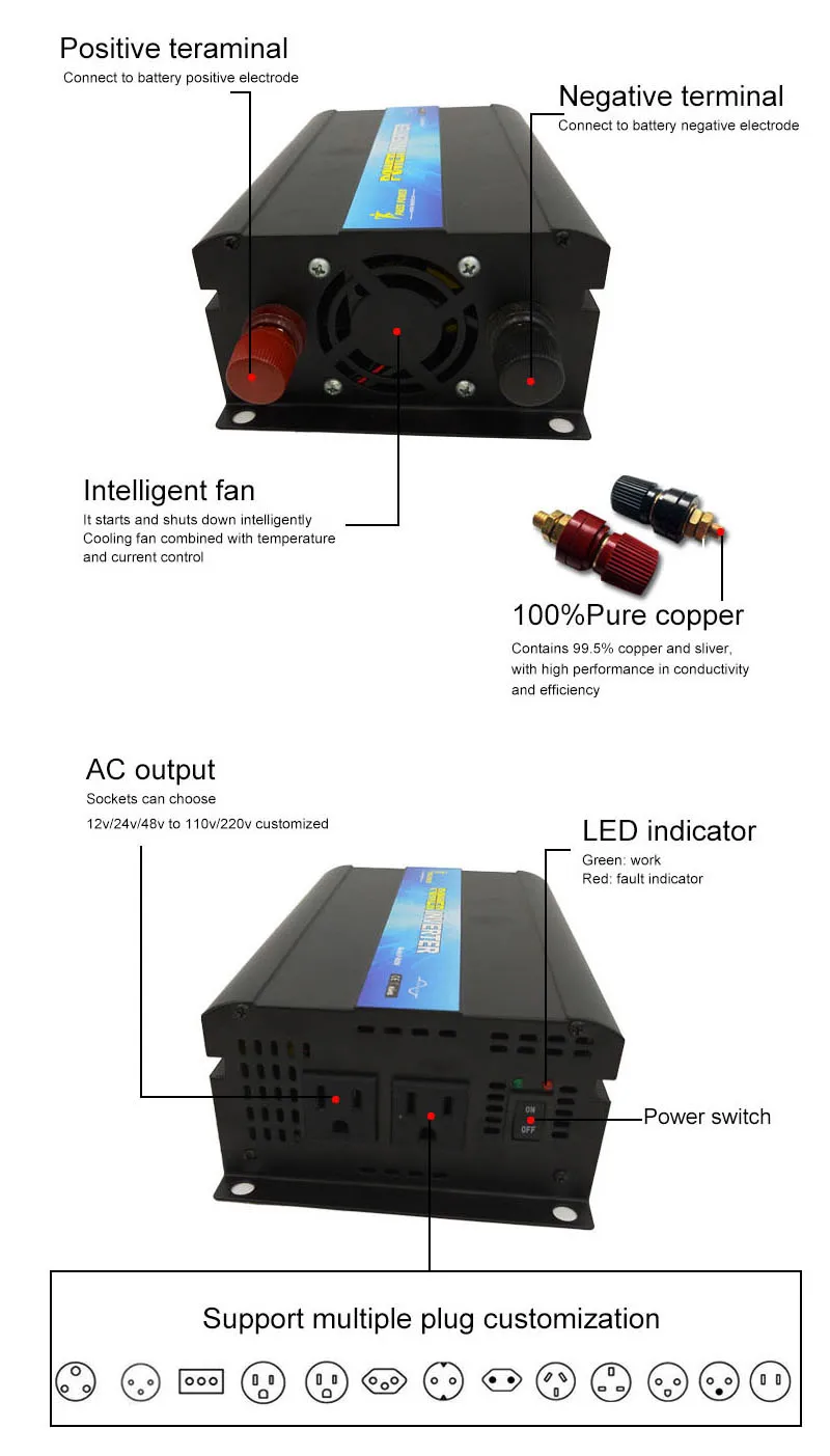 Продукт является чистым синусоидальным инвертором мощности, который преобразует 12 В/24 В/48 В постоянного тока в 100 В/110 В/120 В/220 В/230 В/240 В (50 Гц/60 Гц) переменного тока, на основе высокой производительности и интеллектуального дизайна. Он обладает высокой надежностью, высокой эффективностью, малым весом, небольшим объемом, функциями полной защиты, простотой установки и эксплуатации. Инвертор может быть применен во многих областях, особенно для солнечной фотоэлектрической системы питания.