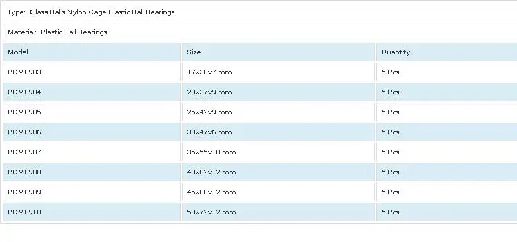 Материал POM и PA с хорошей механической прочностью и износостойкостью. Они подходят для производства прецизионных пластиковых подшипников. Рабочая температура составляет от-60 ℃-100 ℃, с высокой прочностью и гладкой поверхностью, в основном не появляются напряжения, хорошие самосмазывающиеся свойства и низкий коэффициент трения. На основе сохранения традиционных преимуществ пластиковых подшипников, они могут быть применены к точности и более высокой скорости работы. Пластиковые подшипники POM наиболее широко используются для всех палстических подшипников. Внутри и снаружи шаровой материал POM или PA, клетка из армированного стекловолокном нейлона 66(GRPA66-25), шаровой стеклянный шар, шарики из нержавеющей стали или керамические шарики. Такой подшипник физиологически инертный и подходит для контакта с пищей, щелочной окружающей среды, хорошая производительность, но не подходит для работы при коррозии thr кислоты и окружающей среды сильных окислителей.